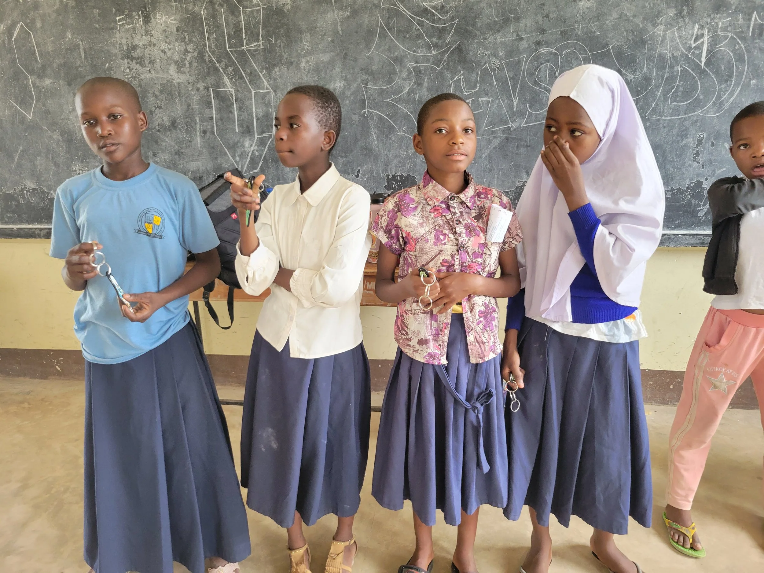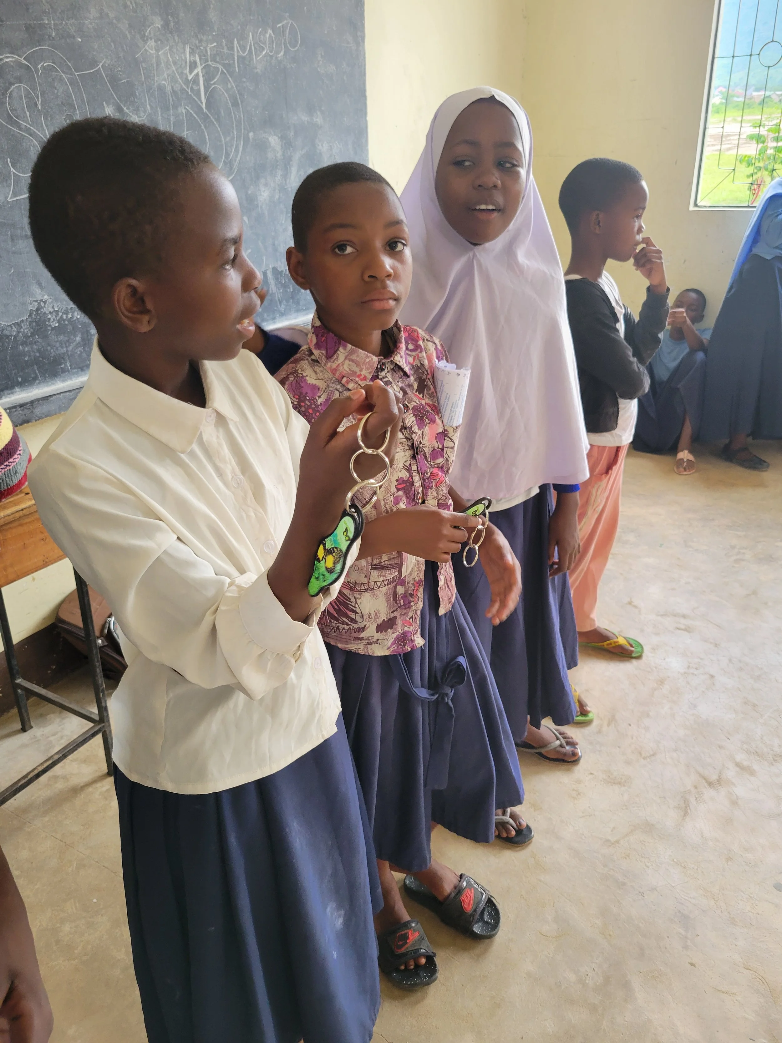 We struggled to stay in the shade, not always successfully. The sun is much more of an issue for the mzungus than for the locals. On this day, my sunburn was peeling from the outdoor classes at Living Positive the prior week. It was attracting attention, as they’d never seen that happen from sun exposure before. Below are all the mentors, with Claudia and me, and the Munio self-defense keychains we handed out.