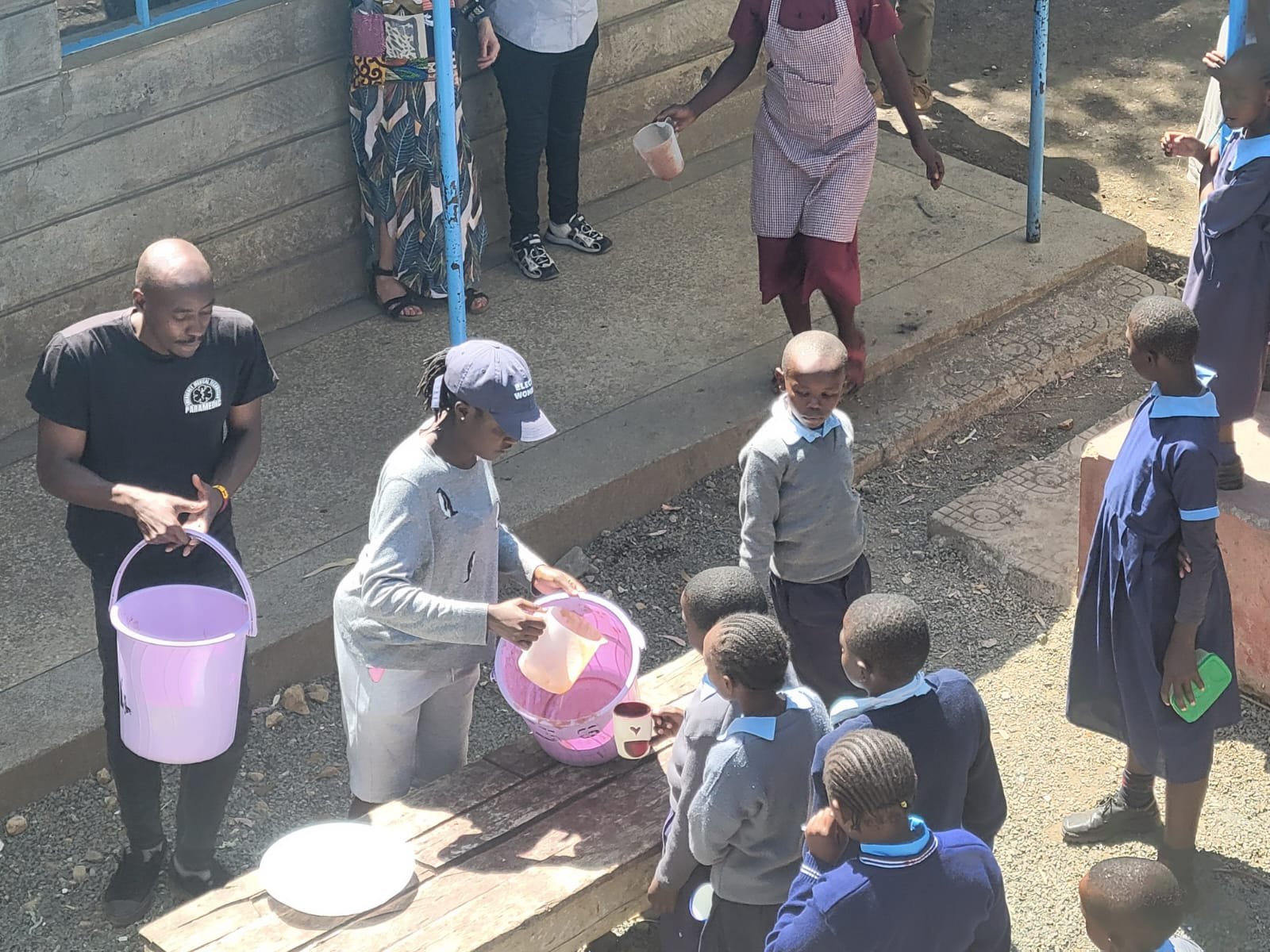 With the girls thoroughly enrolled in school, we headed on to Ilmerijo. We made it in time to serve porridge. As usual Wangari, a quintessential humble leader, jumped in to serve. Cedric was along as well, as we have a self-defense class scheduled. Below, Wangari serves and Cedric brings a refill bucket.