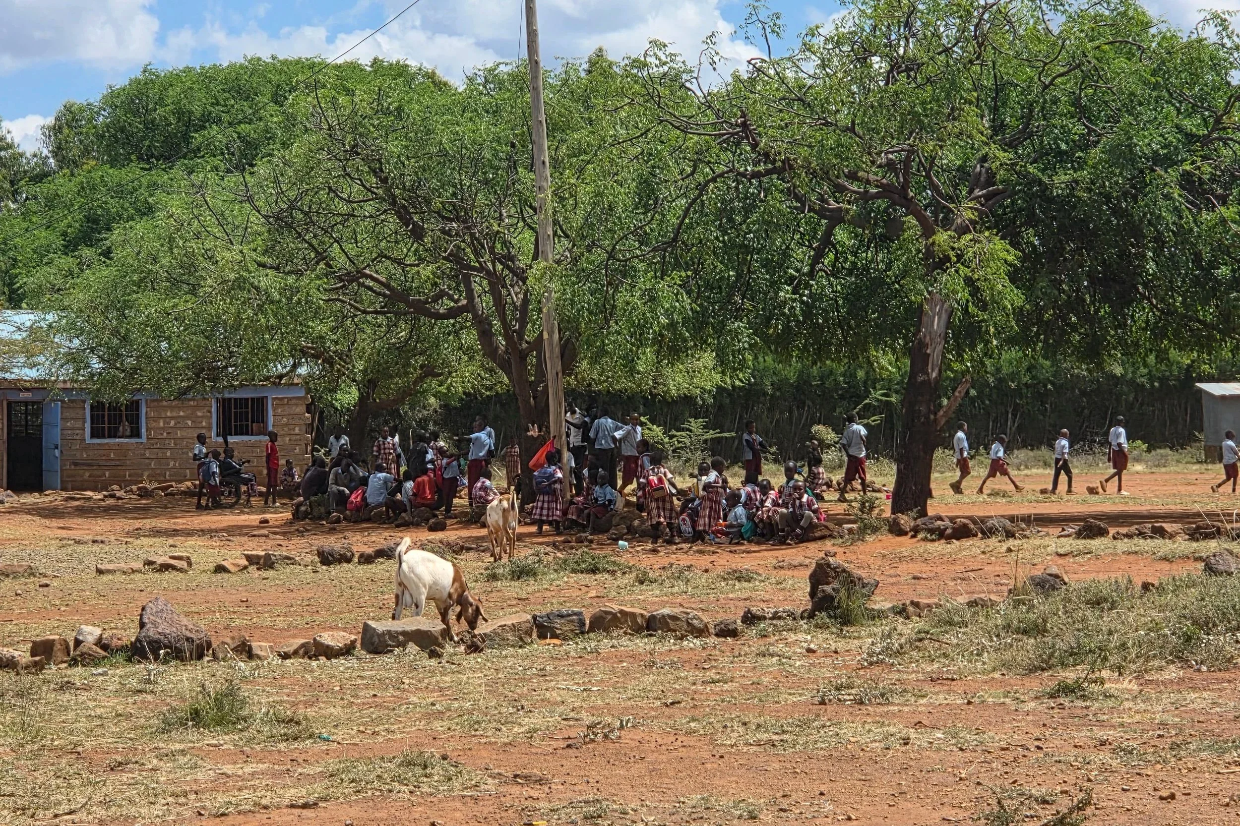 The rest of the kids were playing in the schoolyard. There are several trees that get a lot of traffic under them. The schoolyard is very sunny, hot, and dusty.